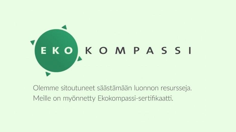 Yrityksellemme on myönnetty Ekokompassi-sertifikaatti ensimmäisen kerran toukokuussa 2021, ympäristöjärjestelmää auditoidaan kolmen vuoden välein ja uuden sertifikaatin saimme kesäkuussa 2024. Olemme sitoutuneet kaikessa yrityksemme toiminnassa säästämään luonnon resursseja. Tämä näkyy konkreettisina tekoina aina lajittelusta materiaalihankintoihin ja yhteistyökumppaneidemme sitouttamiseen.